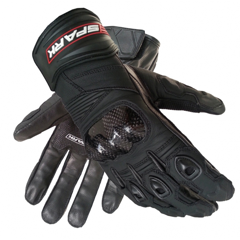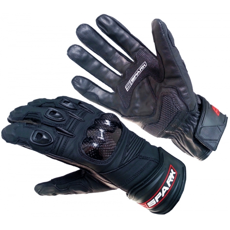 Kožené moto rukavice Spark Sport Motocyklové rukavice špičkové kvality určené zejména pro super sportovní motocykly. Specifikace materiál: jemná telecí a hovězí kůže 0,4 – 0,7mm, Dupont kevlar®, Schoeller keprotec®, polyamid kevlarové protektory prstů, kloubů a zápěstí dvojité švy zdvojená kůže v oblasti dlaně, prstů reflexní pruhy Scotchlite reflex 3M® zesílená malíková hrana trojité upnutí pro maximální cit při řízení BARVA: černá