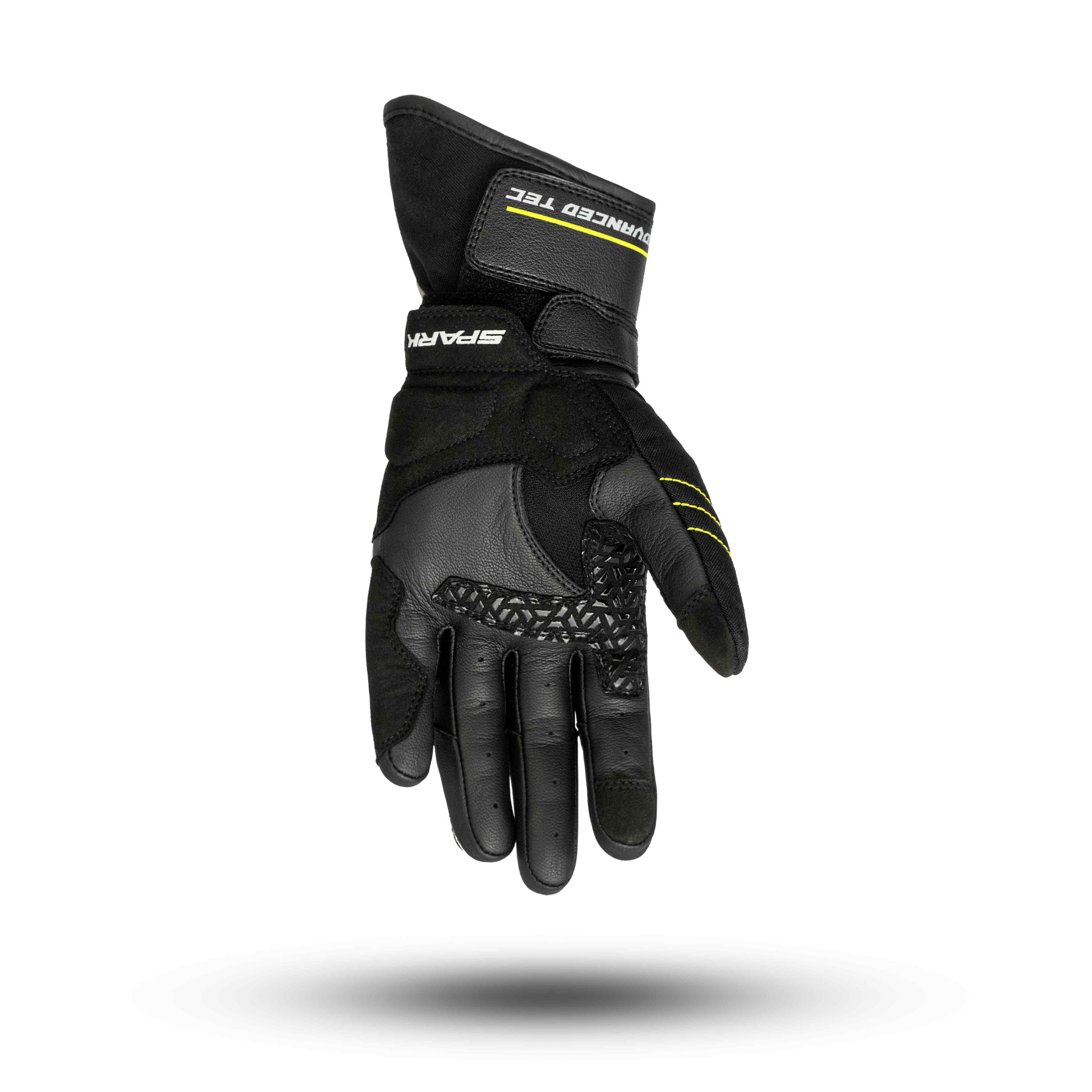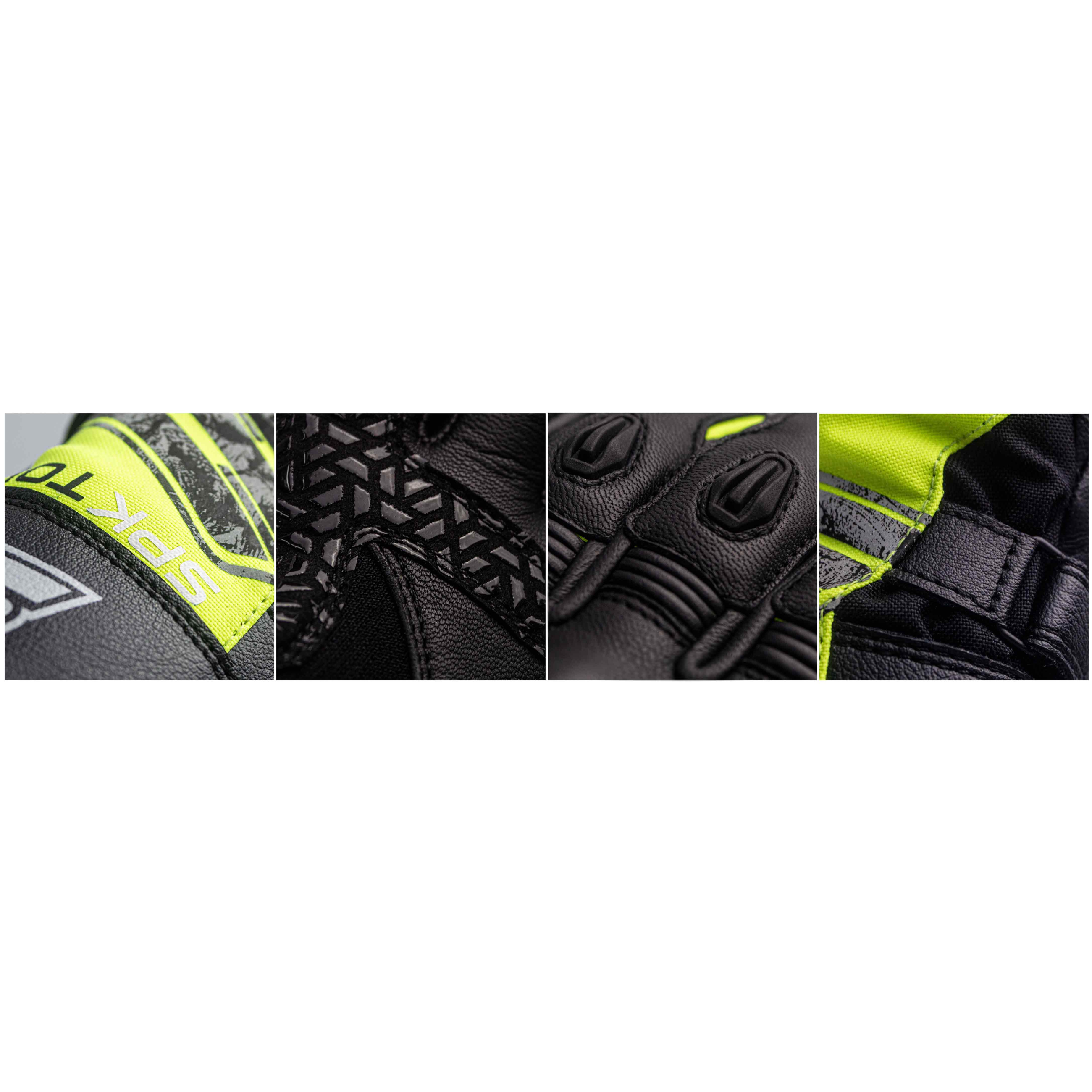 Kombinace textilu a kůže, moto rukavice s chrániči na kloubech a prstech, Accordeon stretch pro lepší pohyb, SPK Flex Grip pro větší pohodlí a materiál na ovládání telefonu. Dlouhá varianta pro maximální ochranu.